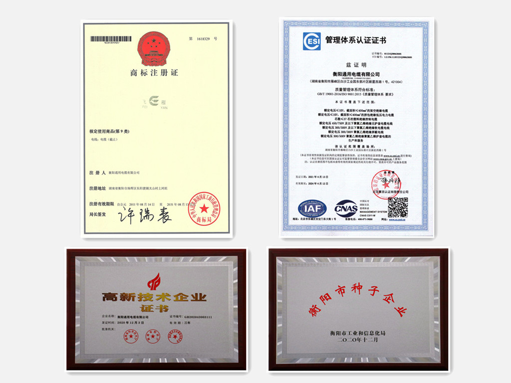 衡陽通用電纜有限公司生產(chǎn)的“飛雁”牌電線電纜嚴(yán)格按照國家標(biāo)準(zhǔn)或機(jī)械行業(yè)標(biāo)準(zhǔn)生產(chǎn),通過ISO9001:2015質(zhì)量管理體系認(rèn)證和“3C”國家強(qiáng)制性產(chǎn)品認(rèn)證,被廣泛應(yīng)用于電力、通信、房地產(chǎn)、地鐵等大型工程項目,公司秉承“不斷奮進(jìn)、盡善盡美”的經(jīng)營理念,先后獲得「衡陽市名優(yōu)產(chǎn)品推介證書」、「湖南省新材料企業(yè)」等多項榮譽(yù)稱號。